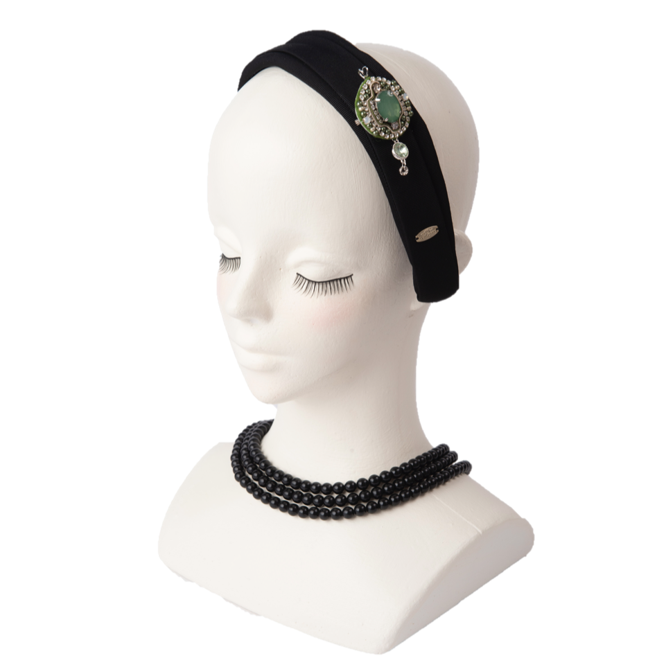 手刺繍工房ラジューとのコラボ、繊細で高級感のあるインドの手刺繍のブローチはグリーンが印象的で華やかです。カチューシャのベースはブローチの取り外してもあとが残らない渡し布付きの仕立てになっていて簡単に外すことができます。オールシーズン様々なシーンでお使いに慣れて飽きのこないデザインは永く使っていただけます。